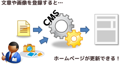 CMS(コンテンツ管理システム)とは一言で表すと「 文章や画像などを登録するだけで、簡単にホームページを更新できるシステム」です。