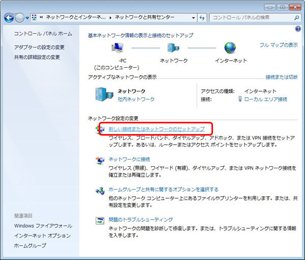 [ネットワークと共有センター]が表示されますので、[新しい接続またはネットワークのセットアップ]をクリックします。