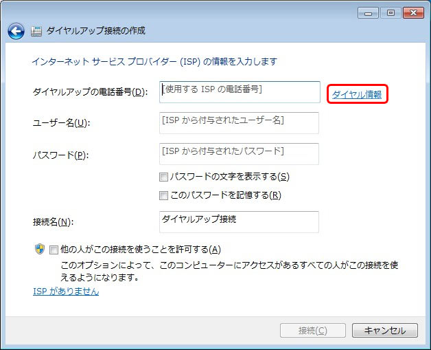 [インターネット サービス プロバイダー(ISP)の情報を入力します]が表示されますので、まず、画面右側上部にある[ダイヤル情報]をクリックし、所在地の設定を行います。