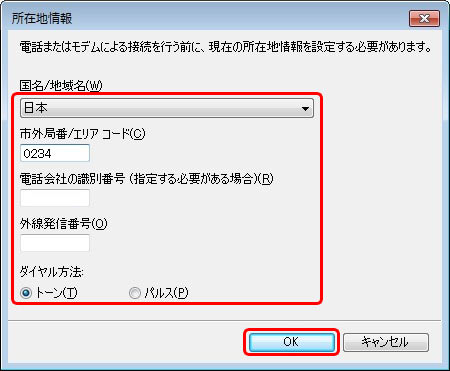 [所在地情報]が表示されますので、必要事項を入力し、[OK]をクリックします。