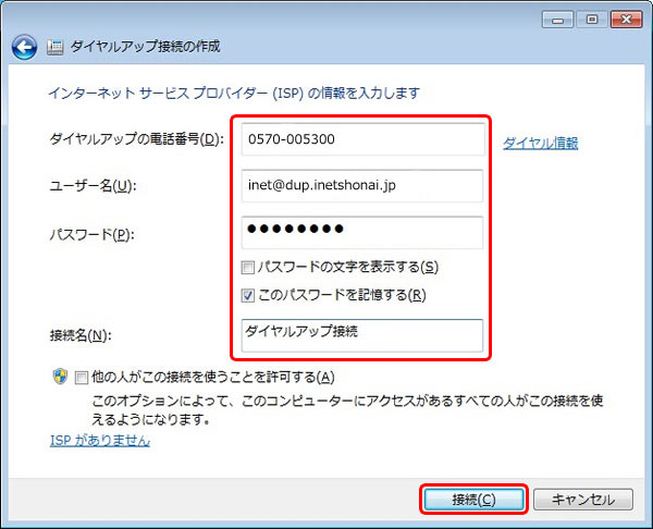 [ダイヤルアップ接続の作成]画面が表示されますので、必要事項を入力し、[接続(C)>]をクリックします。