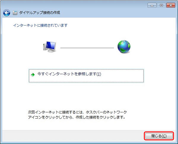 接続に成功すると、「インターネットに接続されています」と表示されますので、[閉じる(C)] をクリックします。