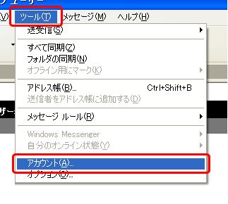 Outlook Expressを起動し、メニューバーの[ツール(T)]から[アカウント(A)]をクリックします。