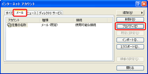 [インターネットアカウント]画面が表示されますので、[メール]タブを選択し、設定を変更するアカウントを選び、[プロパティ(P)]をクリックします。