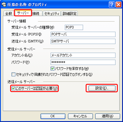 [プロパティ]画面が表示されますので、[サーバー]タブを選択し、[このサーバーは認証が必要(V)]にチェックを入れ、[設定(E)]をクリックします。