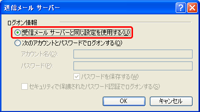 [送信メールサーバー]画面が表示されますので、[受信メールサーバーと同じ設定を使用する(U)]にチェックを入れ、[OK]をクリックします。