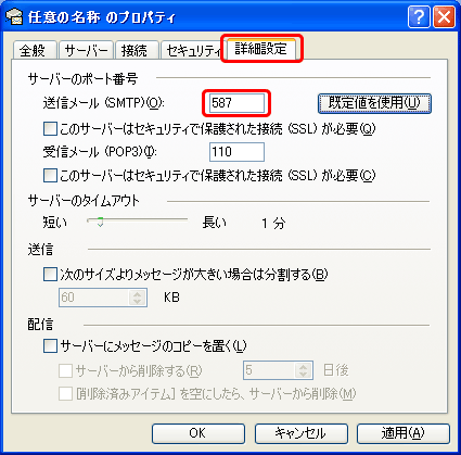 [プロパティ]画面の[詳細設定]タブを選択し、[サーバーのポート番号]項目の[送信メール(SMTP)(O)]の値を“587”に変更し、[OK]をクリックします。
